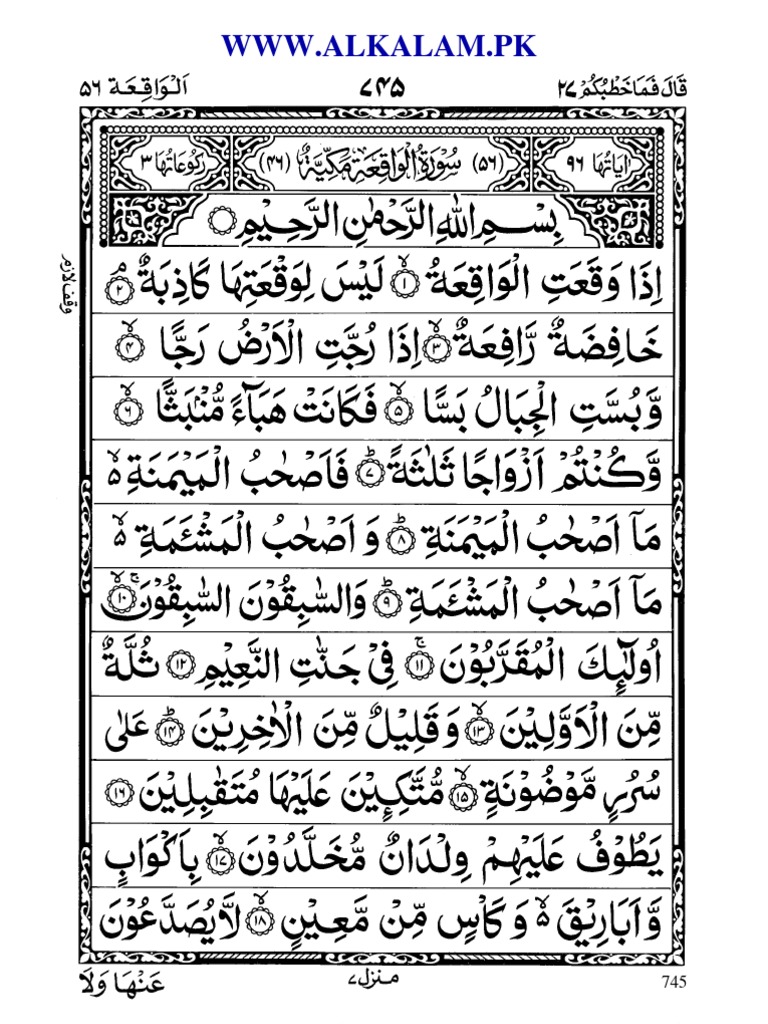 The Surah takes its name from the word al-waqiah of the very first verse. It is easy on eyes and is with Urdu translation. Muslims are residing in different countries and it is a reason that the Holy Quran is now translated into several languages.